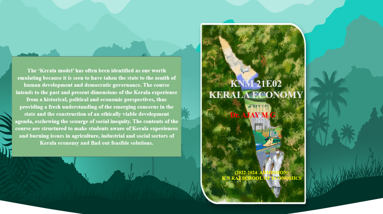 The ‘Kerala model’ has often been identified as one worth emulating because it is seen to have taken the state to the zenith of human development and democratic governance. The course intends to the past and present dimensions of the Kerala experience from a historical, political and economic perspectives, thus providing a fresh understanding of the emerging concerns in the state and the construction of an ethically viable development agenda, eschewing the scourge of social inequity. The contents of the course are structured to make students aware of Kerala experiences and burning issues in agriculture, industrial,service and social sectors of Kerala economy and find out feasible solutions.